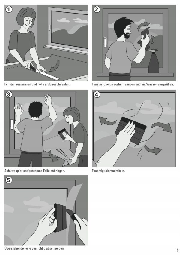 Statyczna folia okienna o matowej, mlecznej powłoce przylega bez kleju, może być usunięta bez pozostałości i może być ponownie użyta bez żadnych problemów. Statyczna folia okienna filtruje szkodliwe promienie UV, zapewnia przyjemny klimat w pomieszczeniu i zapobiega szybkiemu nagrzewaniu się pomieszczeń.
